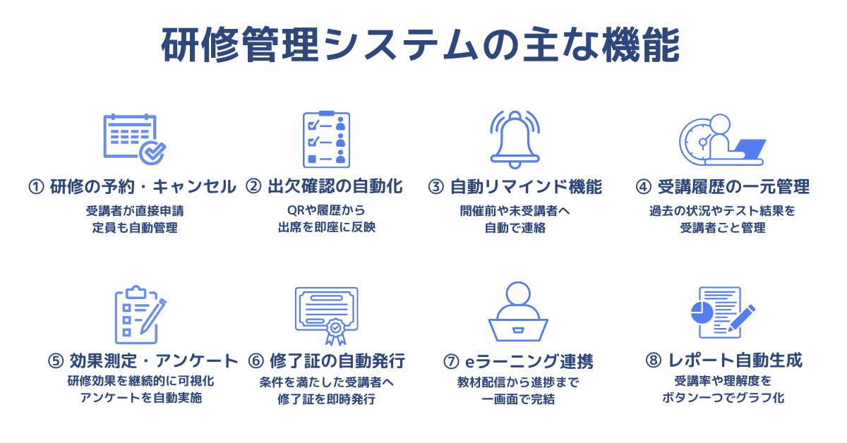 現代の研修管理システムは、名簿管理だけでなく、研修前後の煩雑な事務作業を統合する多機能なプラットフォームとなっています。