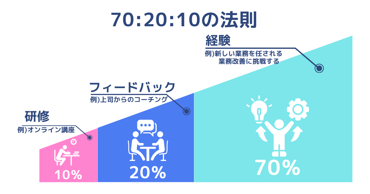70:20:10の法則は、人の成長において「70%が実際の経験」「20%が他者からのフィードバック・指導(薫陶)」「10%が形式的な研修」という割合が効果的な学習方法であるという考え方です。下記図が示すように、学びの大部分である70%は日常業務を通じた実践経験から得られ、知識が行動に結びつき、実践的なスキルとして定着していきます。そして20%のフィードバックを先輩や仲間から受けることで、他者の視点や経験を取り入れ、自分だけでは気づけなかった改善点や新たな視点を獲得できます。残り10%の研修や自己学習は基礎知識の習得に有効ですが、それだけでは実践力は身につきません。この3つの要素を組み合わせることで視野が広がり、研修で得た知識を実務で活かせます。この法則は、新入社員から管理職まで、すべての人材が持続的に成長できる理想的な学習環境です。日本企業のOJT文化と相性が良く、実践的な人材育成を実現できます。
