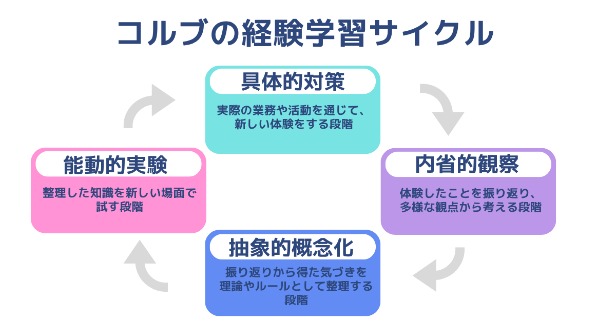 人は 「経験→振り返り→理論化→実践」 の4段階を繰り返すことで、学びを定着させ成長していくという考え方です。