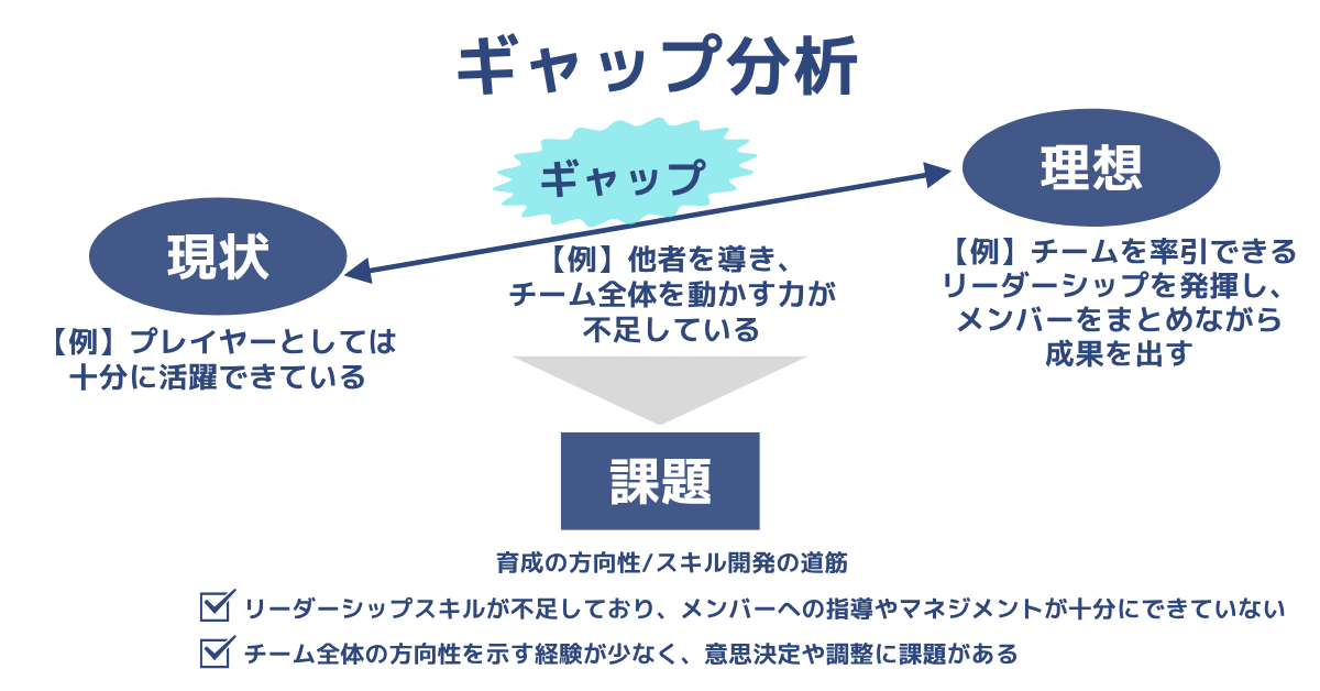 このような状態を「ギャップ」として把握し、理想である「チームを牽引できるリーダーシップを発揮し、メンバーをまとめながら成果を出す」姿へと近づけるための具体的な課題を整理していきます。