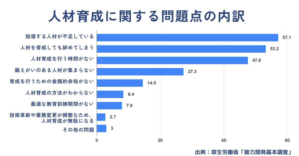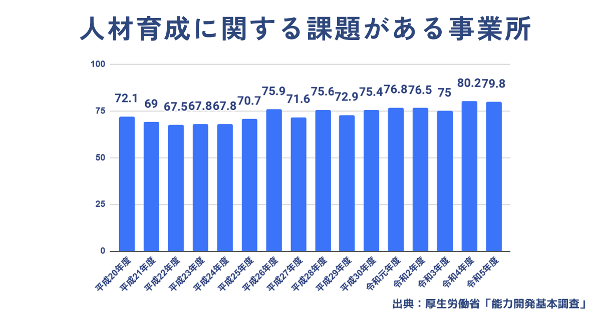 人材育成は企業にとって欠かせない取り組みですが、取り組んでいても思ったような成果につながらないケースがあります。厚生労働省の「能力開発基本調査」によると、7割以上の企業が「人材育成に課題がある」と答えています。