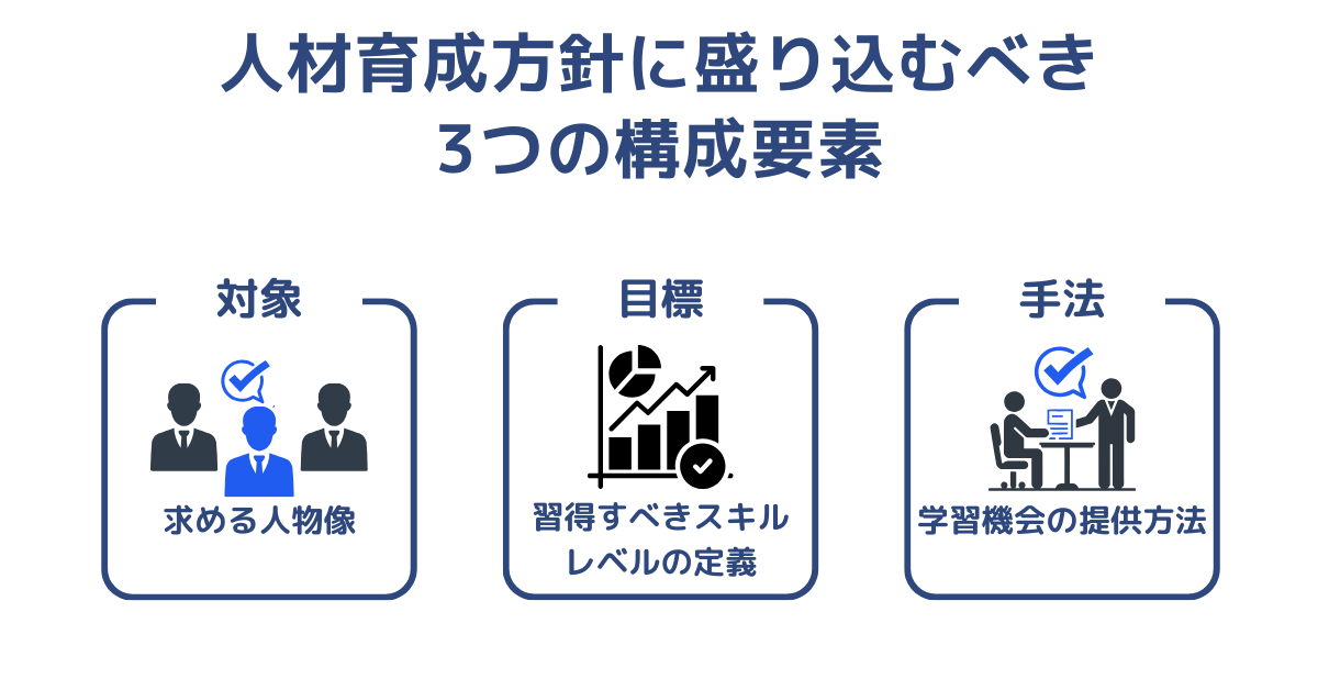 現場で「使える方針」を作るために、この3つの柱が明確であるほど、具体的な教育施策へとスムーズに落とし込みやすくなります。